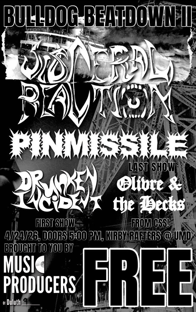 Death Metal, Thrash Metal, Hardcore and more: Bulldog Beatdown II has it for you. The second annual show will run Friday, Apr 24, at 5 pm in the Kirby Rafters at UMD. This concert, sponsored by the Music Producers club on campus, features four local bands: Visceral Reaction, Pinmissile, Drunken Incident, and Olivre & the Decks will perform at the free event. Liam Urbanowicz, one of the event organizers and a drummer in Visceral Reaction and Drunken Incident, says the inspiration for the show comes from his dad, who “went to UMD back in the day, and he saw a band called Powermad play in Kirby Ballroom.” After hearing that, Urbanowicz wanted to bring it back, this time with his own band and others.