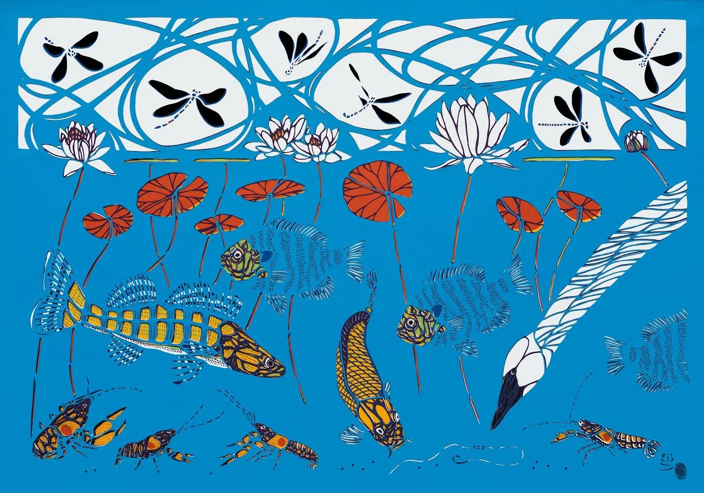 Her featured pieces depict aquatic life; specifically, native and non-native species and their interactions with each other, as well as people’s perceptions of them. Sandbeck is particularly interested in lesser-known native species, as they tend to be overlooked despite being important to their environments.