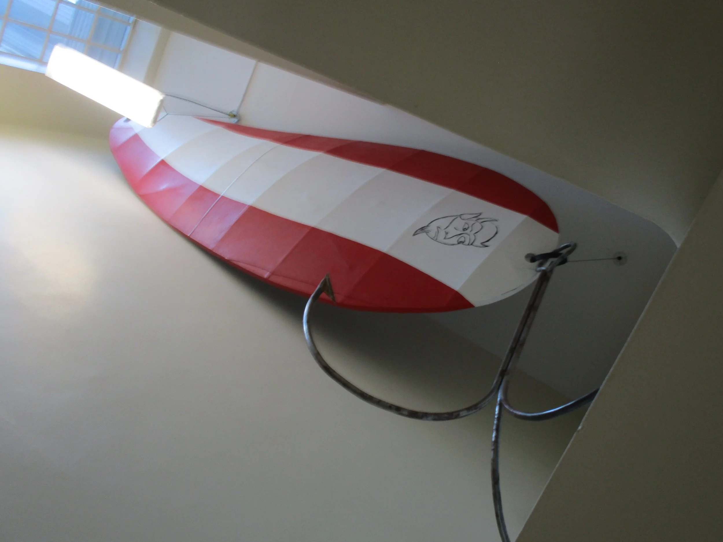 Giant lure by John Simenson tucked against the ceiling. Photo by Elise Lockner, Feb 13