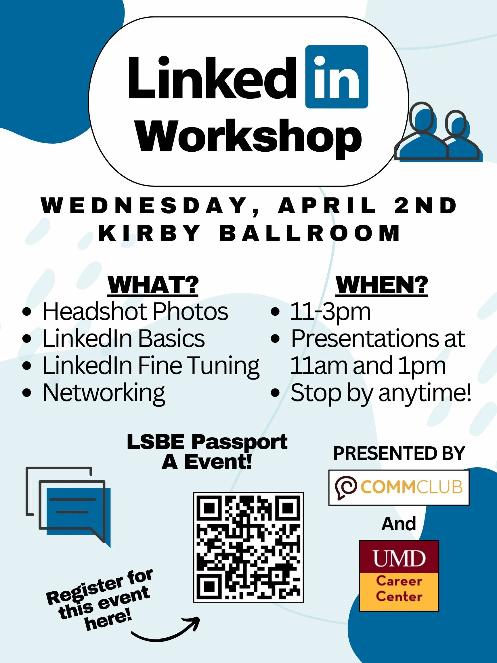 The COMM Club and Career Center are holding their second annual LinkedIn Workshop on Wednesday, April 2, from 11 a.m. - 3 p.m. in Kirby Ballroom. Students will be able to get headshots, network with others and learn ways to improve profiles.