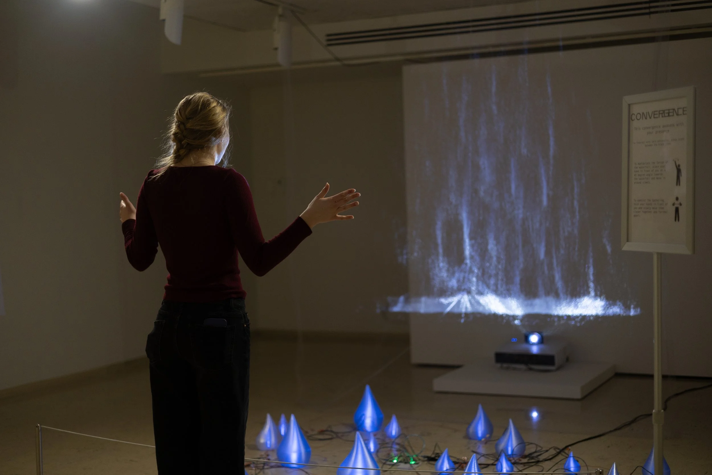 If you were lucky enough to stop by the Tweed Museum between March 24-27, you would have been able to manipulate the forces of a waterfall and control the intensity of light on water droplets. Addison Severs decided to provide this immersive experience for his senior exhibition titled “Convergence.”