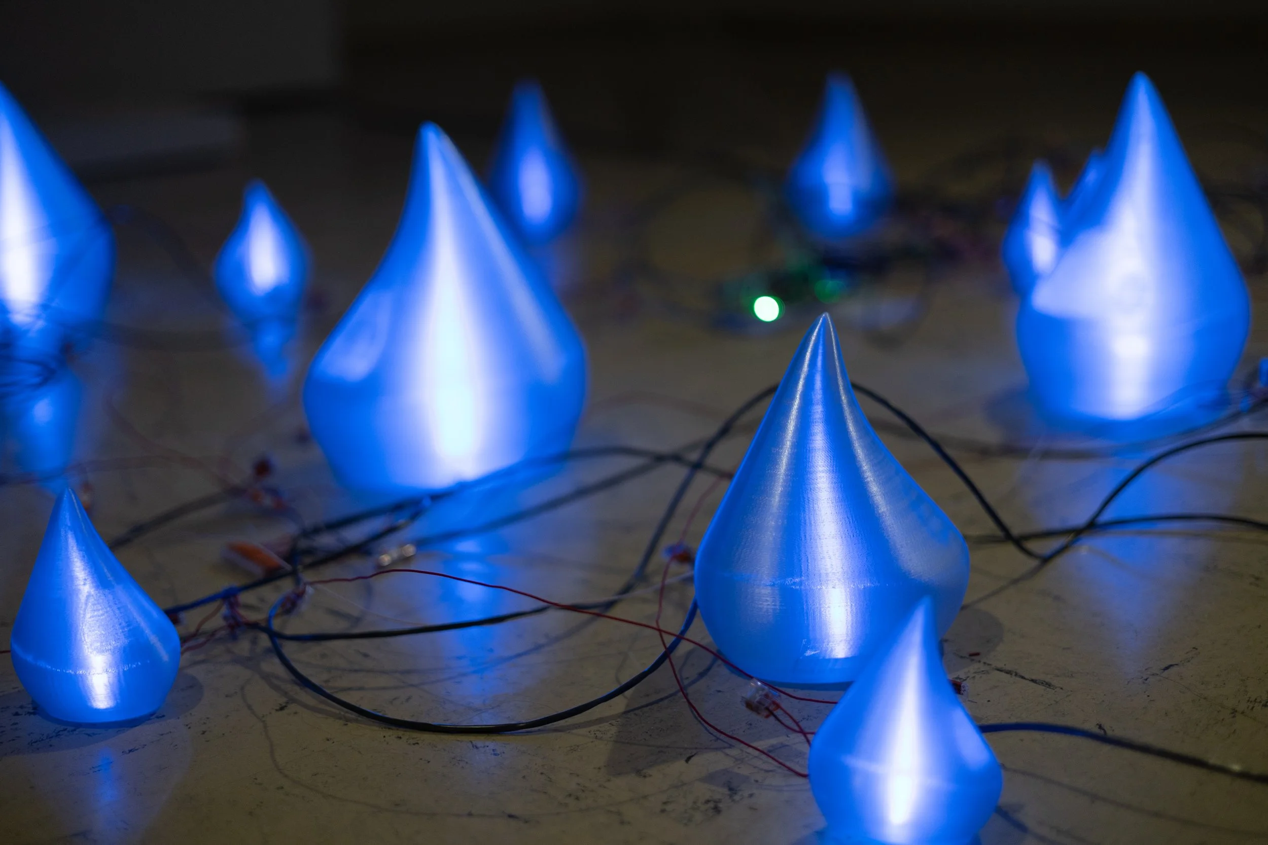 On the ground in front of the waterfall were water droplet forms connected to microcontrollers that brighten and dim depending on how far apart the person's hands are from each other, made possible by the individual LED pixels inside of them.