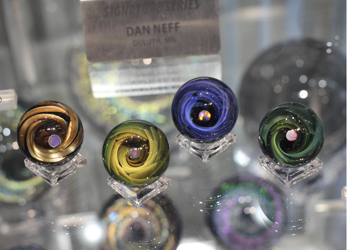 Dan Neff’s signature series is on display, each containing an inlaid opal, flecks of silver, and gold. Photo by Jonah Schmieg