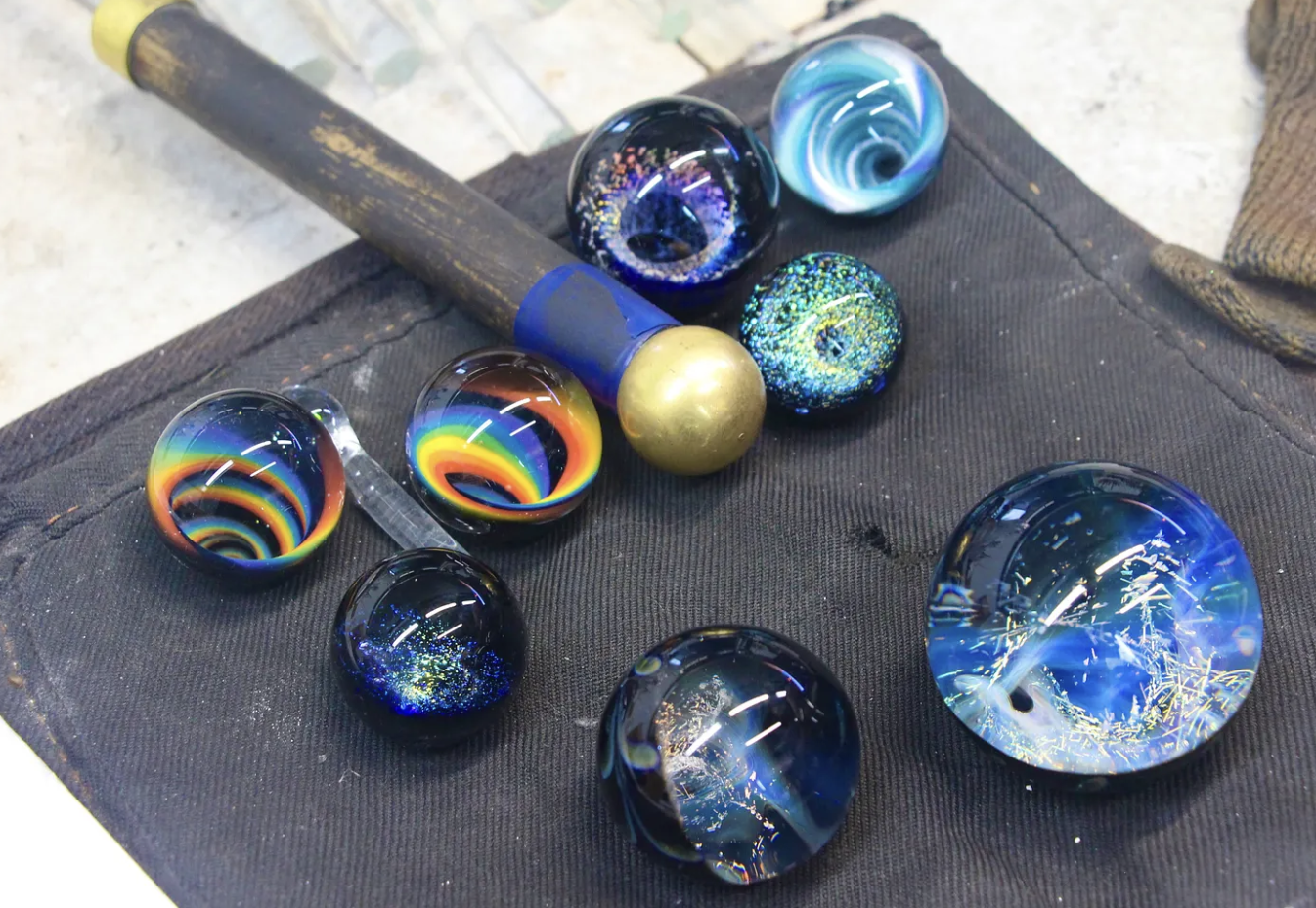 The marbles on a work bench Dan Neff is currently working on. Photo by Jonah Schmieg.