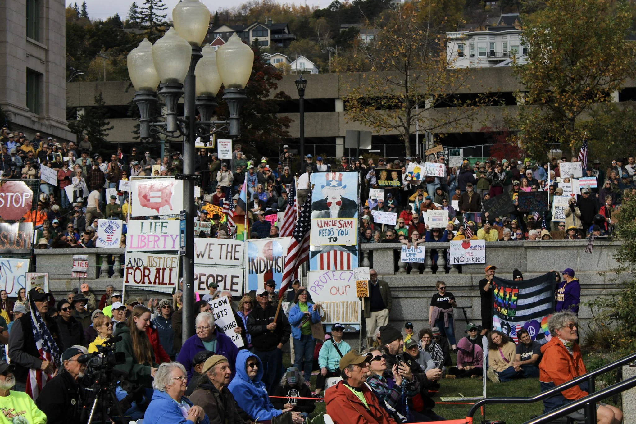 Thousands of Minnesotans gather outside of Duluth City Hall with signs displaying patriotism. Photo by Finlee Matejcek