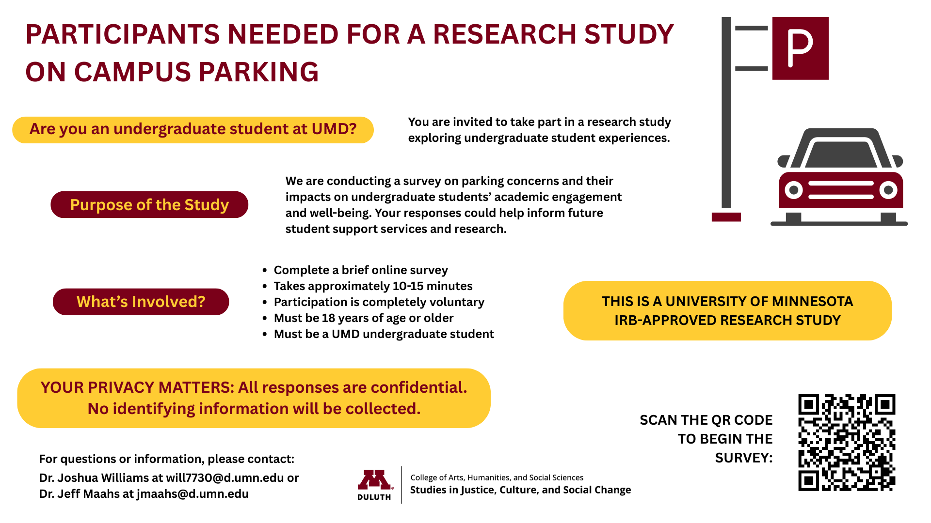 UMD undergraduate students are welcome to take a survey to voice their concerns about parking on campus. Scan the QR code below to participate!