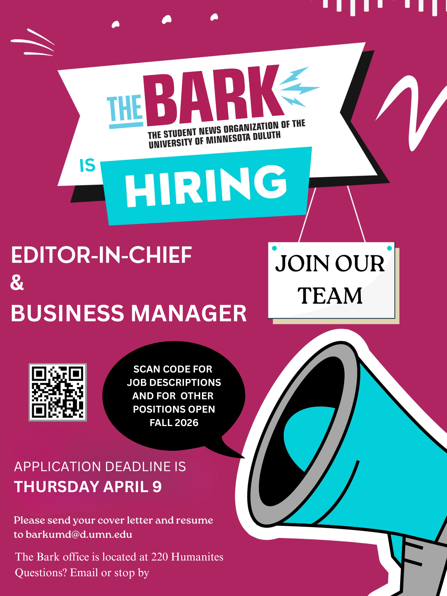 The official newspaper of UMD, The Bark, is hiring for the 2026-2027 school year! We are looking for dedicated students who are informed and engaged in the greater campus community. Be a leader in student media as the next Editor-in-Chief or Business Manager. Submit your application: resume and cover letter by Thursday, April 9. Find information about additional media positions in graphic design and social media under About.