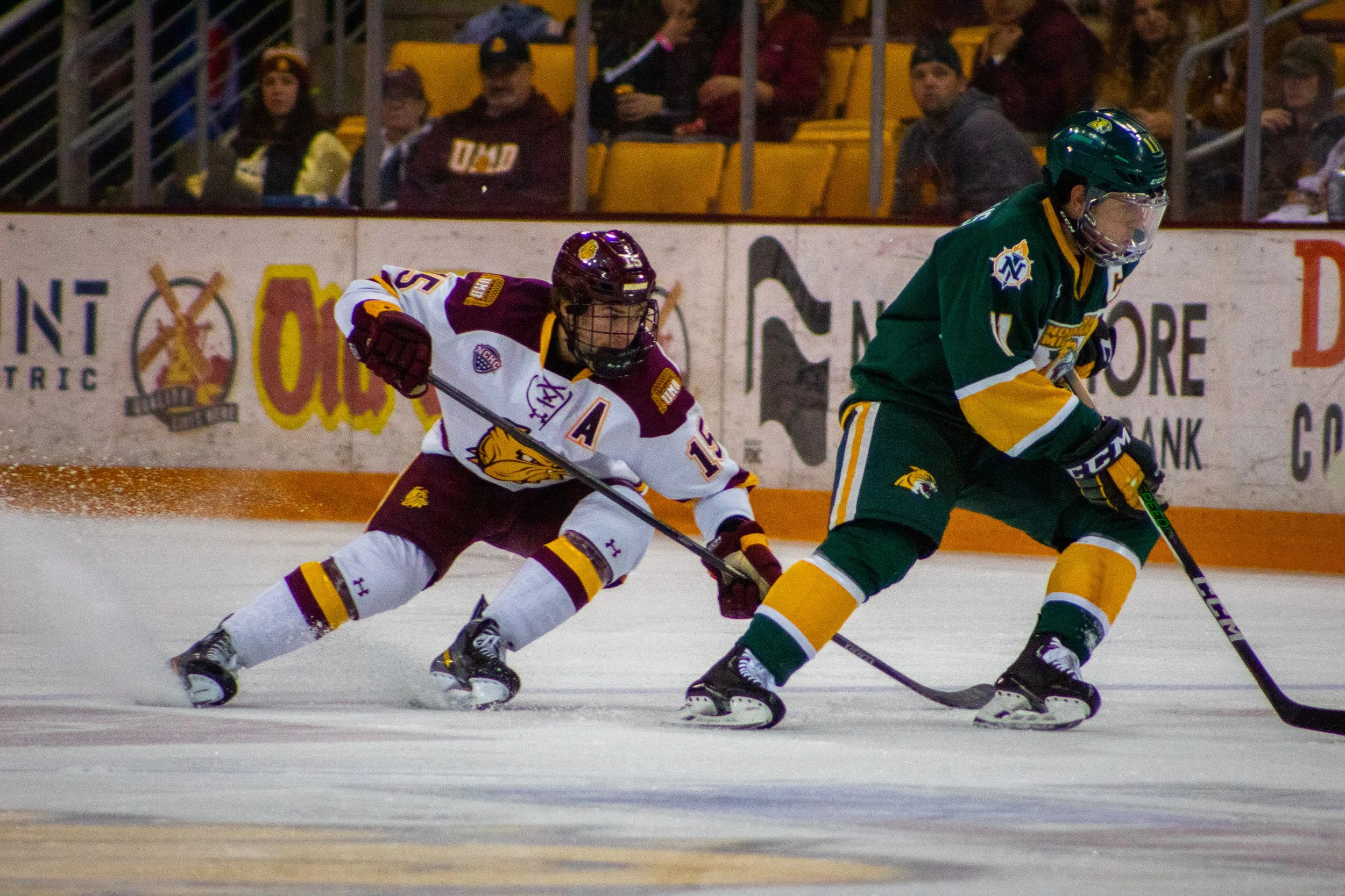 UMD's Anthony Menghini looks at the puck after NMU's Aiden Gallacher takes a shot.