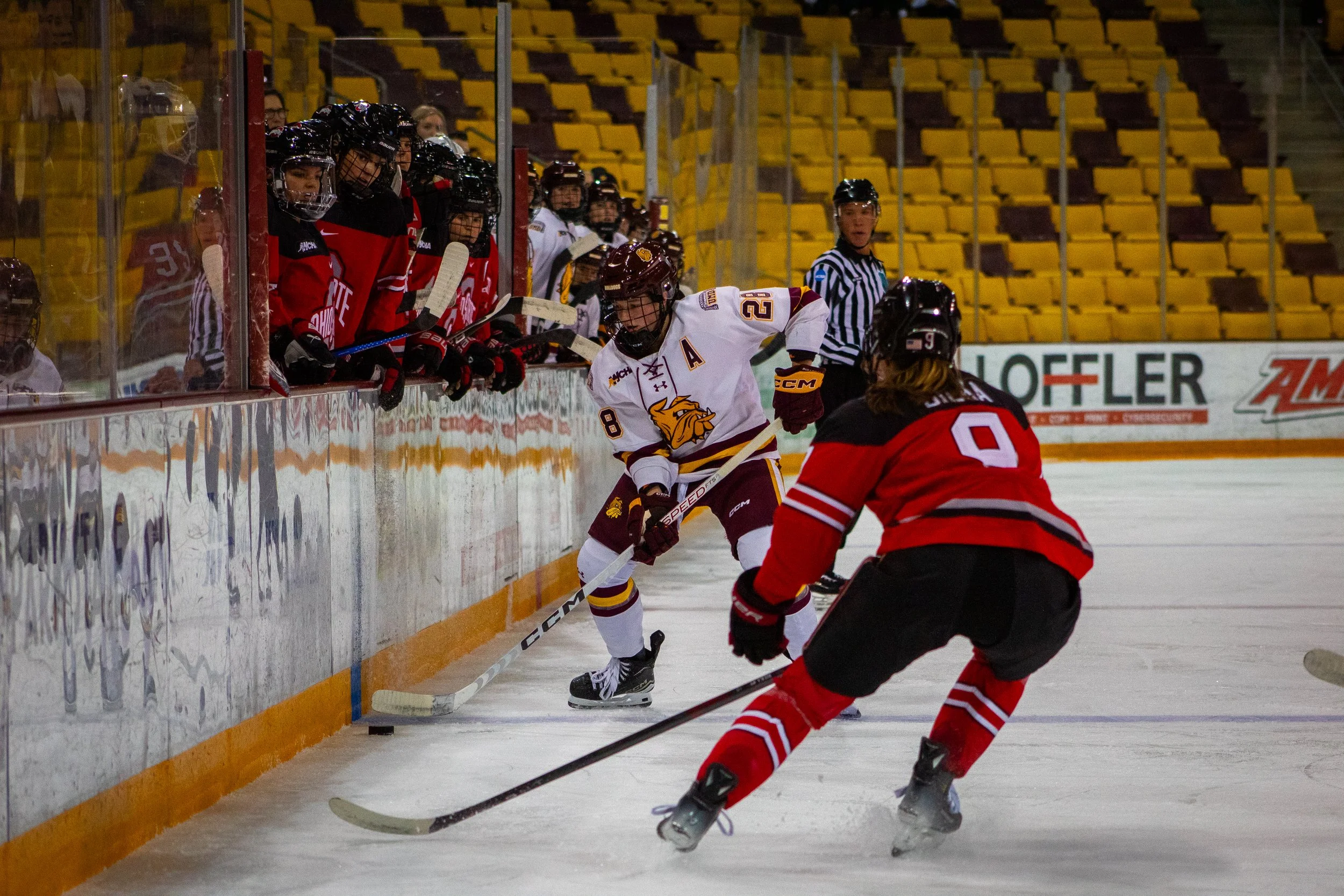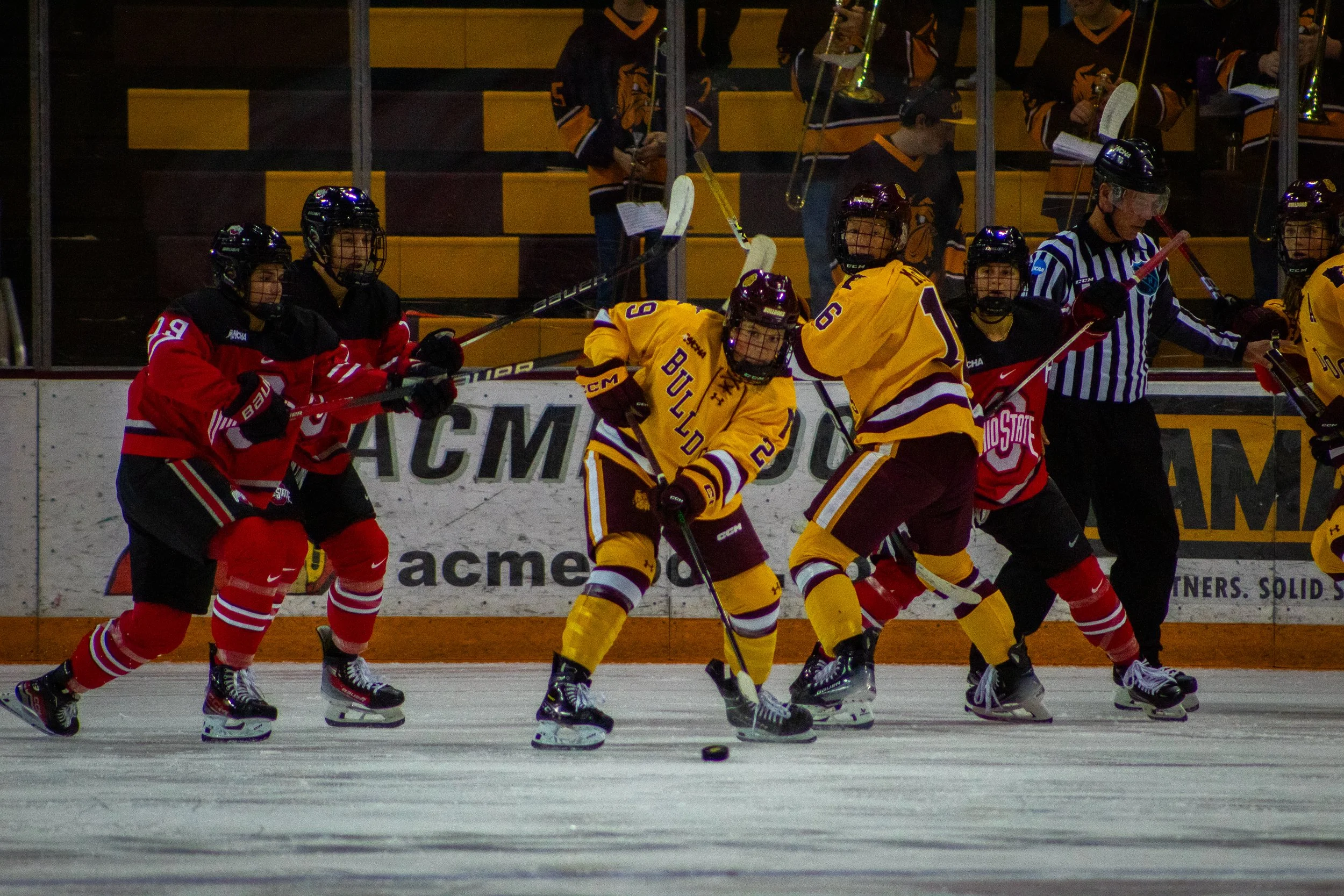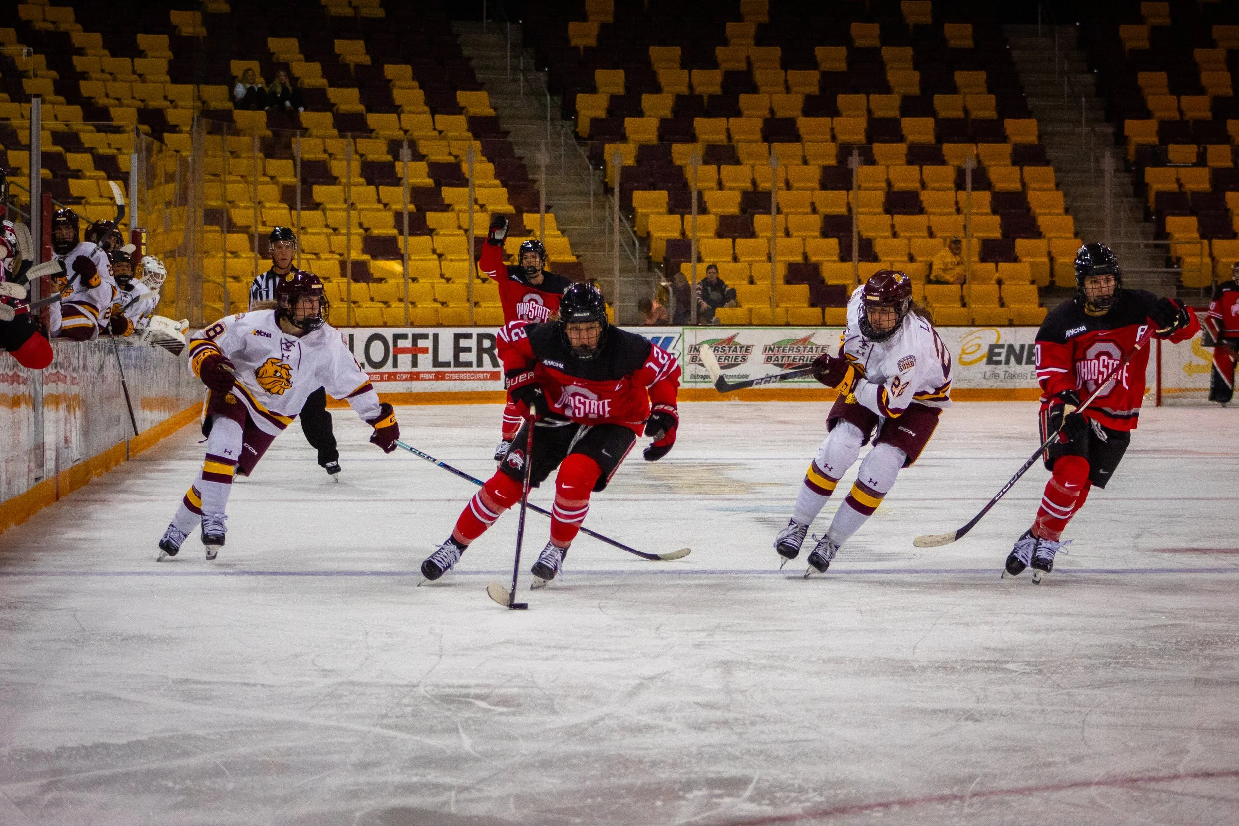Ohio State's Jennifer Gardiner skates past UMD players.