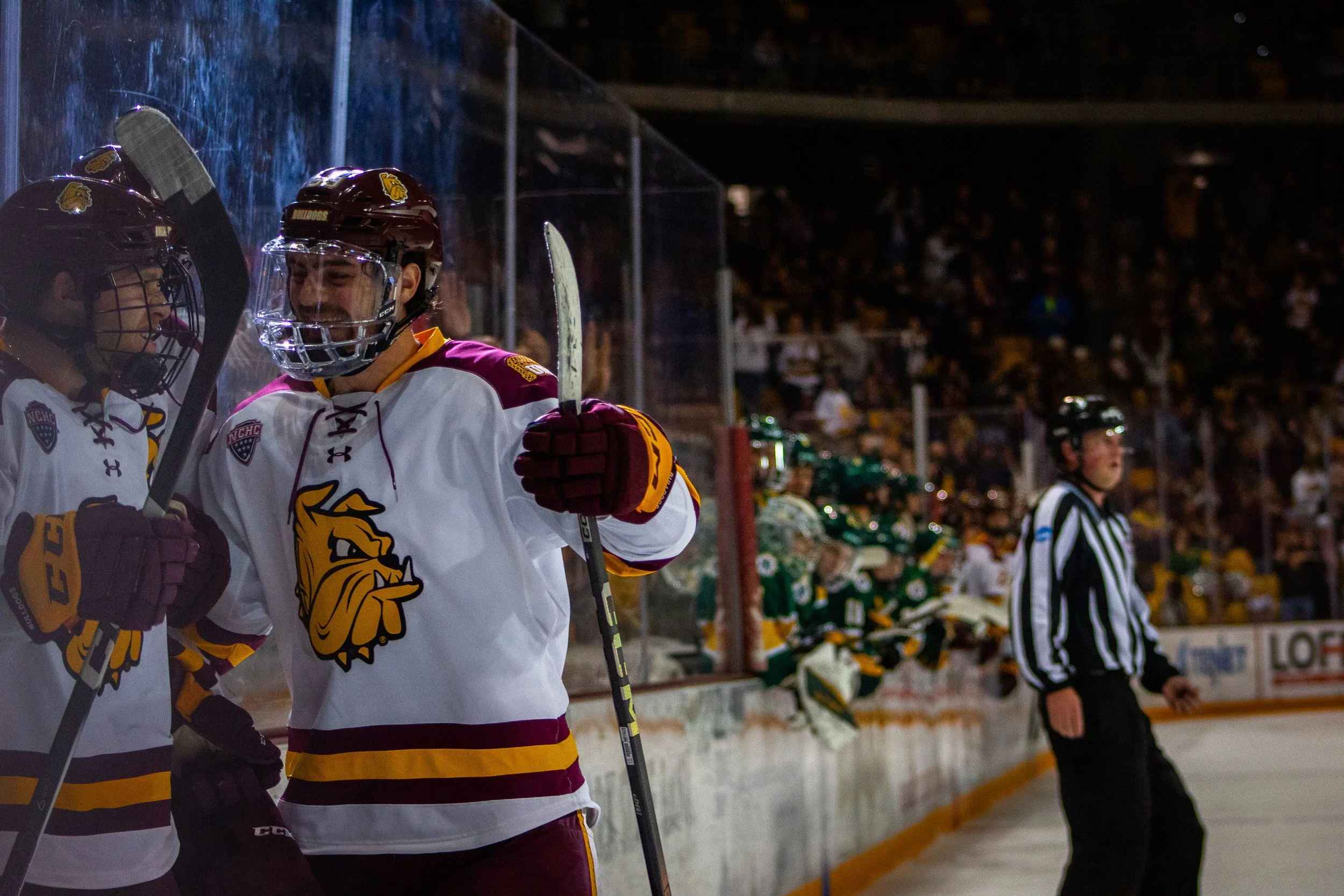 UMD Bulldogs celebrate after scoring an early goal.