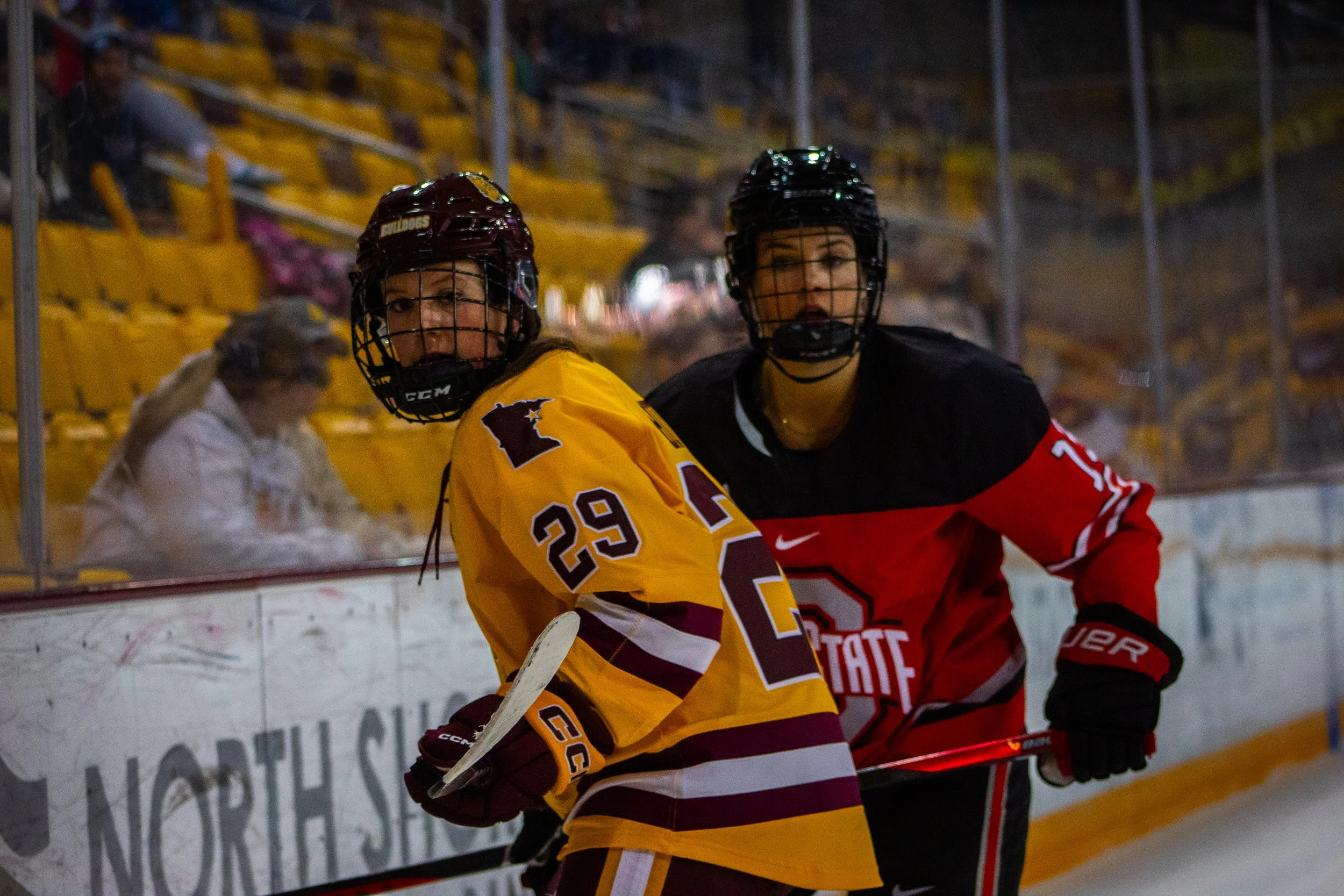 UMD's Olivia Wallin scuffles with Ohio State's Lauren Bernard for the puck.